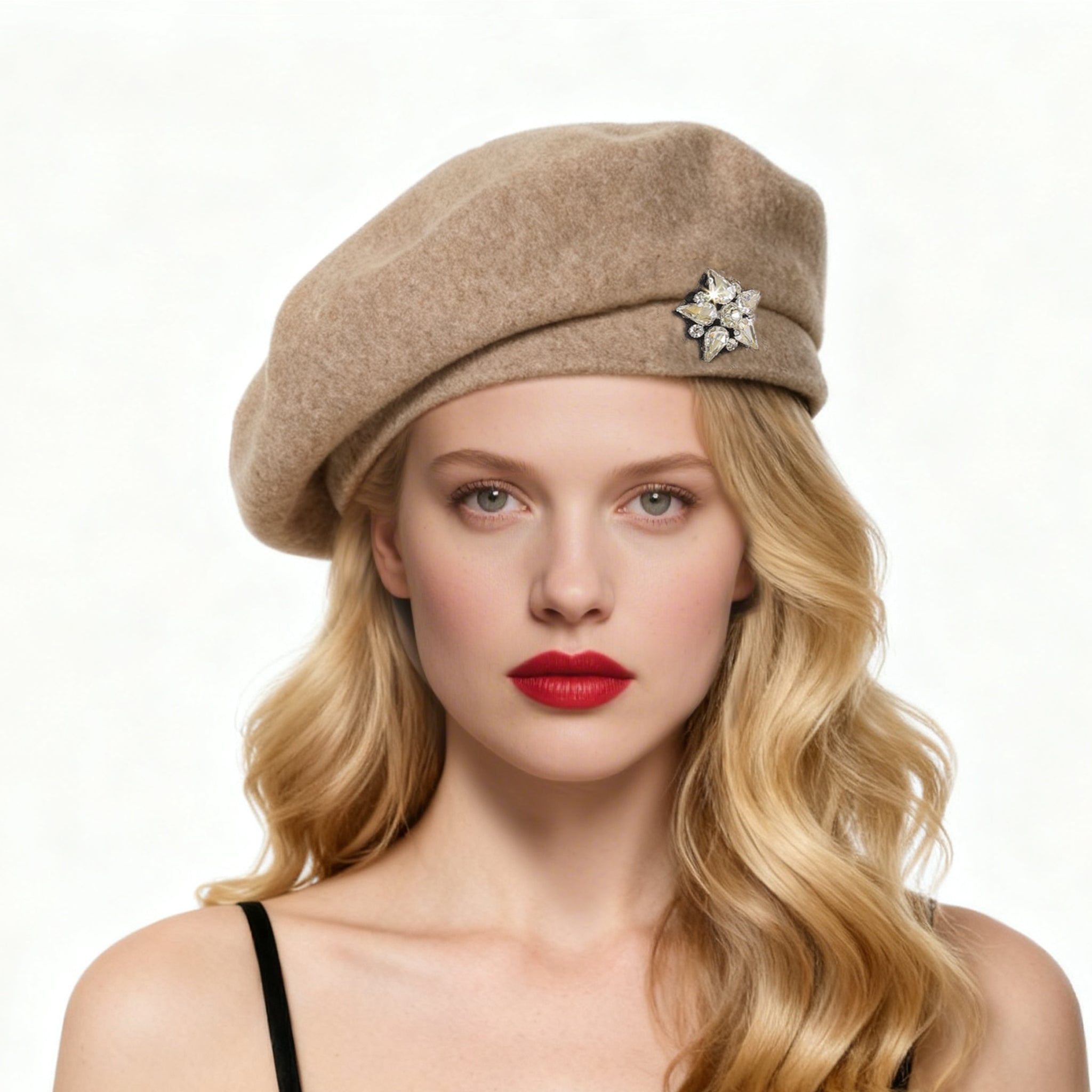 Design: Classic felt beret with rhinestone embellishments